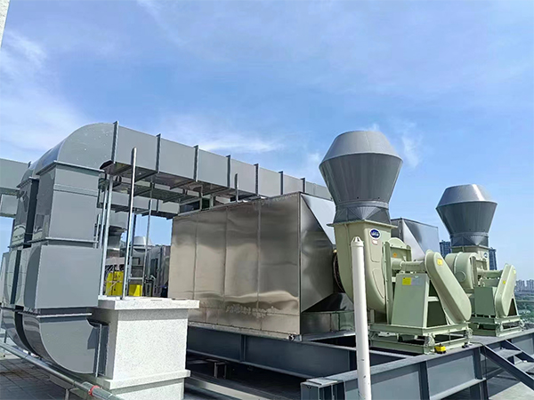 1、活性炭吸附裝置,即主風管到達樓頂后連接活性炭吸附裝置再連接離心風機,凈化后的尾氣排出去。